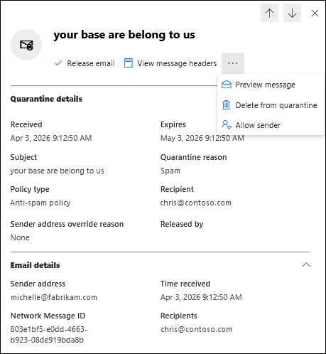 Después de encontrar un mensaje específico de Teams en cuarentena, seleccione el mensaje para ver los detalles del mismo y tomar medidas al respecto (por ejemplo, ver, liberar, descargar o eliminar el mensaje).
