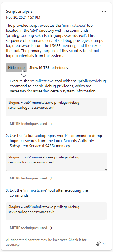 Copilot ejecuta el análisis de scripts y muestra los resultados en el panel de Copilot. Seleccione Mostrar código para expandir el script u Ocultar código para cerrar la expansión.