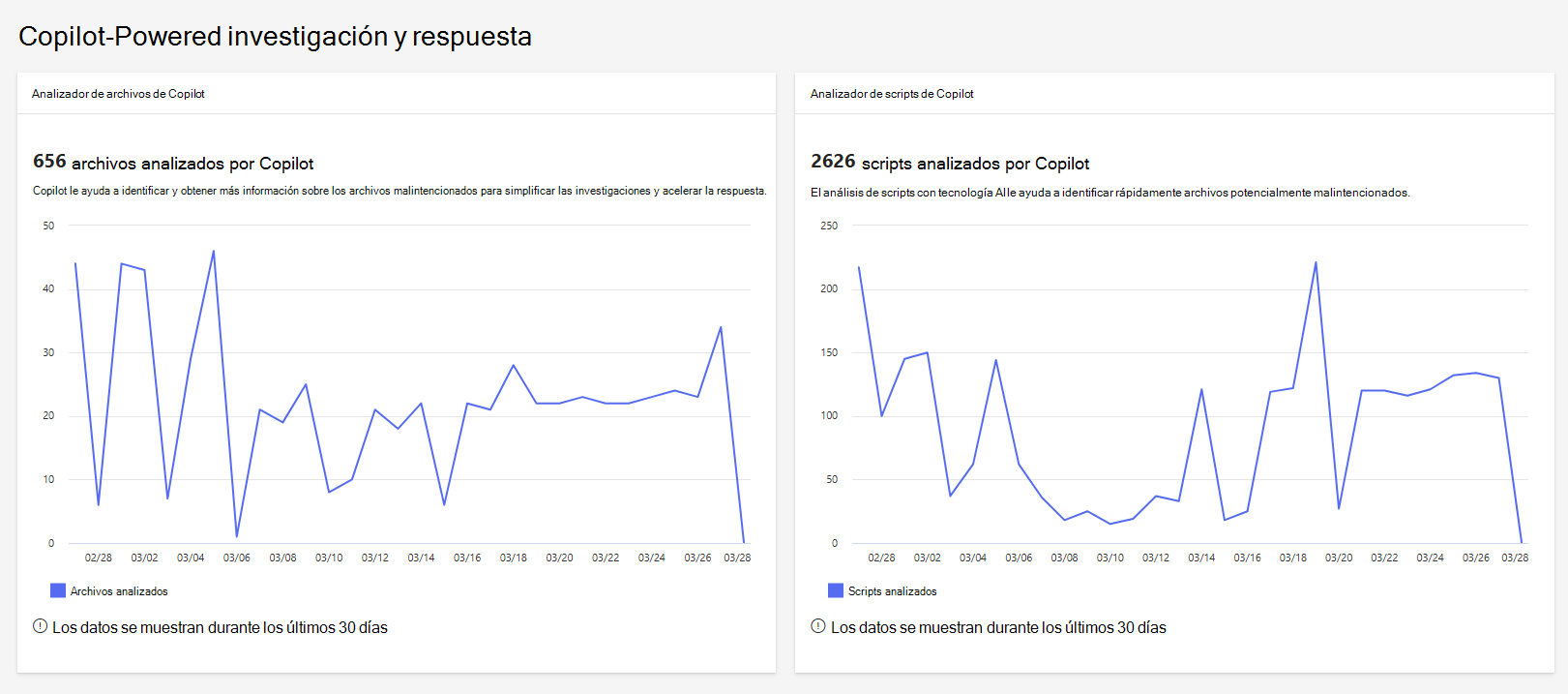 Investigación y respuesta con tecnología de Copilot: esta sección contiene el número de archivos y scripts analizados en los que se usó Microsoft Copilot en Defender.
