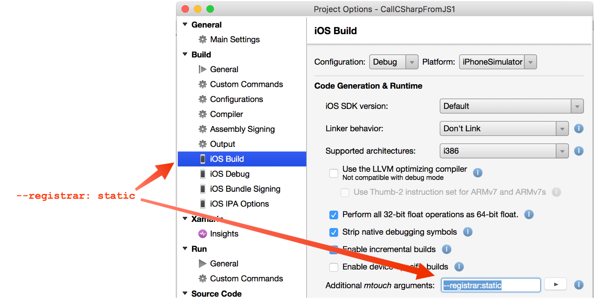 In order to export a C# object so that it is visible to JavaScript, the developer must add the --registrar:static argument to the arguments used by mtouch. In Xamarin Studio, this is done in the Project Options dialog, in the Build Options / iOS Build pane:
