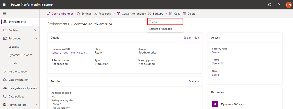 Para realizar una copia de seguridad y restaurar un entorno de producción, primero conviértalo a un entorno limitado, realice las operaciones de copia de seguridad y luego vuelva a convertirlo a un entorno de producción. Las operaciones de ciclo de vida del entorno, como copia y copia de seguridad y restauración, no se permiten en entornos de producción. Consulte Convertir un entorno aislado en un entorno de producción para obtener más detalles. Ya debe tener el entorno de destino disponible en su inquilino. Para ver el entorno de destino, vaya a Administrar>entornos en el Centro de administración de Power Platform. Si no tiene un entorno de destino (espacio aislado), contacte con el soporte técnico de Microsoft para obtener ayuda.