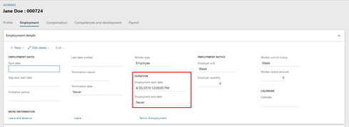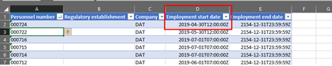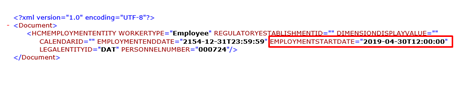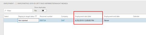 En el siguiente ejemplo, el empleo del empleado 000724 se activa al mismo tiempo independientemente de zona horaria. El empleado estará activo el 30/04/2019 en la zona horaria del GMT, que es lo mismo que 01/05/2019 en la zona horaria GMT+12:00. Ambas hacen referencia el mismo momento dado y no a una fecha concreta.