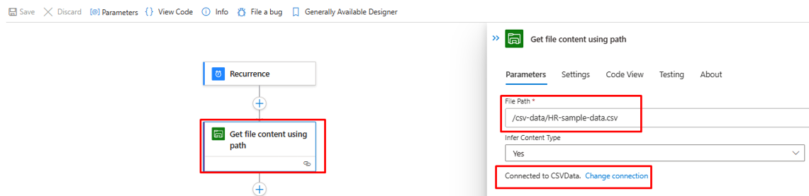 Abra el paso "Obtener contenido de archivo mediante la ruta de acceso" y corríjalo para ir al almacenamiento de archivos de Azure en su inquilino.