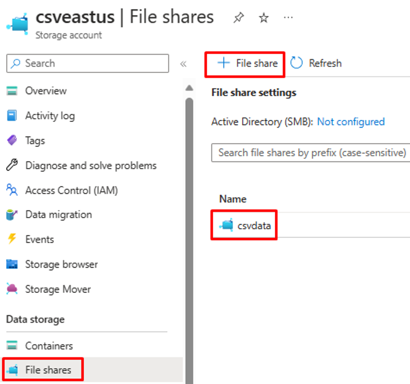 - Cargue un archivo CSV de ejemplo en el recurso compartido de archivos mediante la opción de carga.