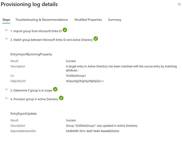 En los registros de aprovisionamiento, puede buscar SOATestGroup1 y comprobar que el grupo se aprovisionó.