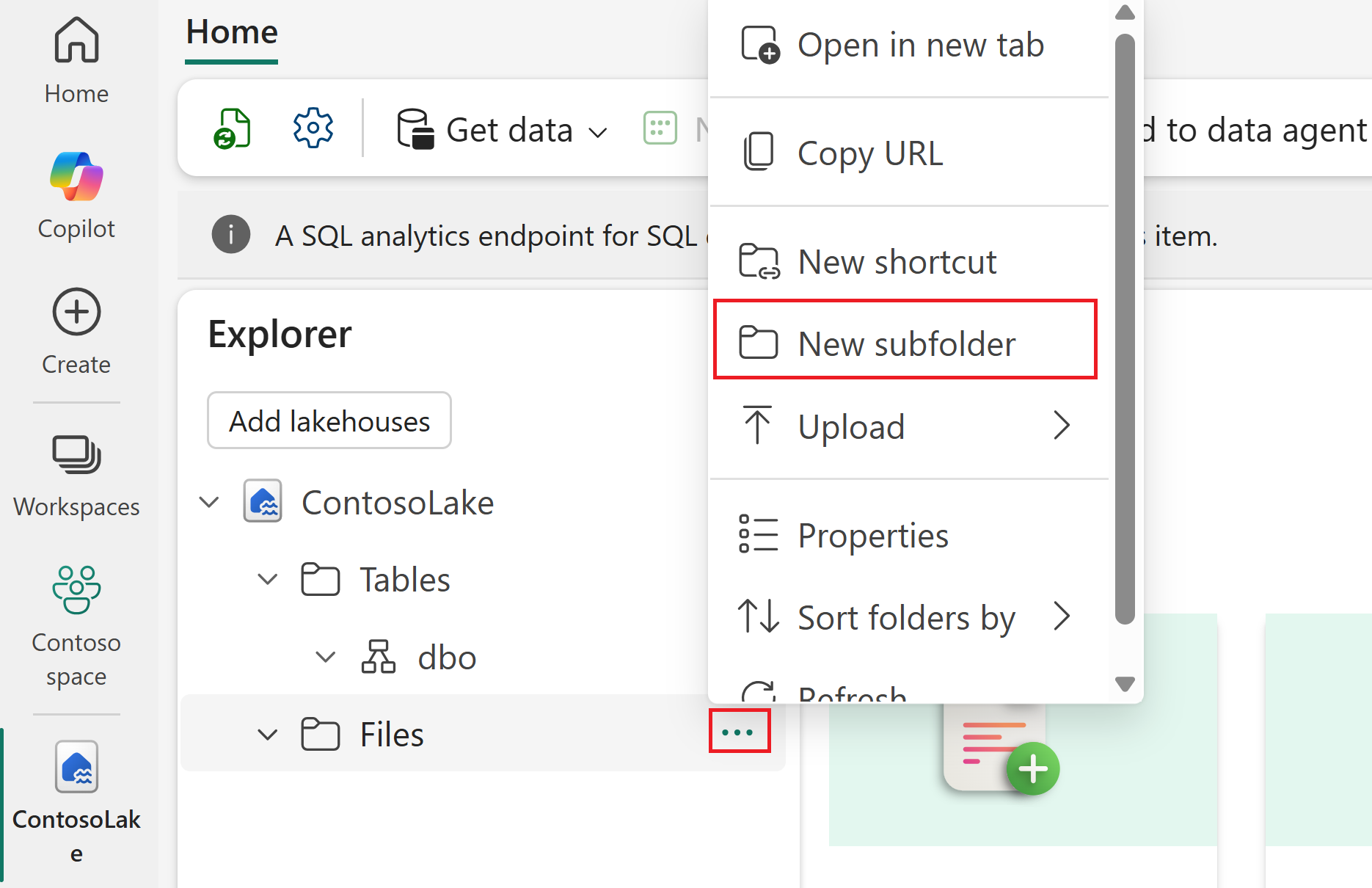 TaxiDataen la secciónFilesde tu lakehouse.Seleccione los puntos suspensivos (...) situados junto a la