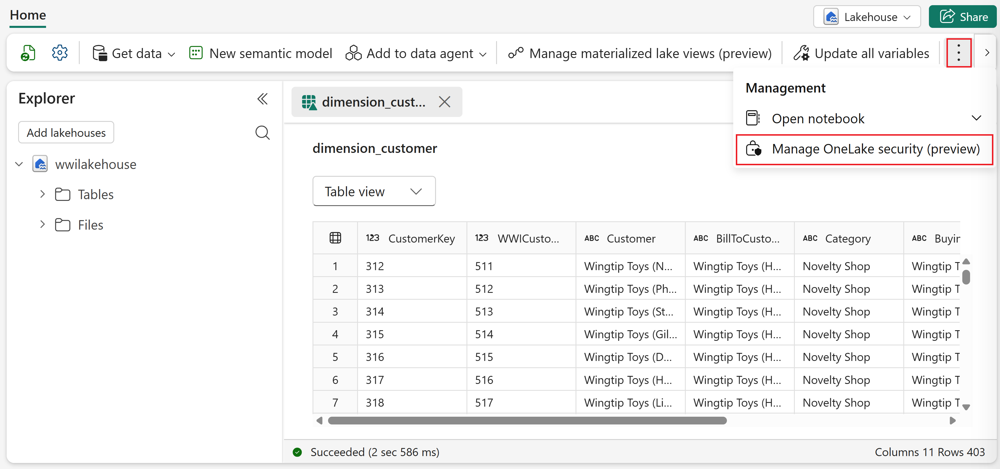 Seleccione Administrar seguridad de OneLake (versión preliminar) en la cinta de opciones y confirme que desea habilitar los roles de acceso a datos (versión preliminar) para el lakehouse.