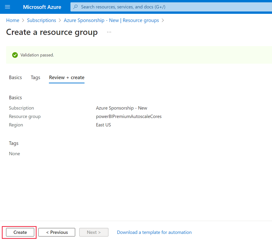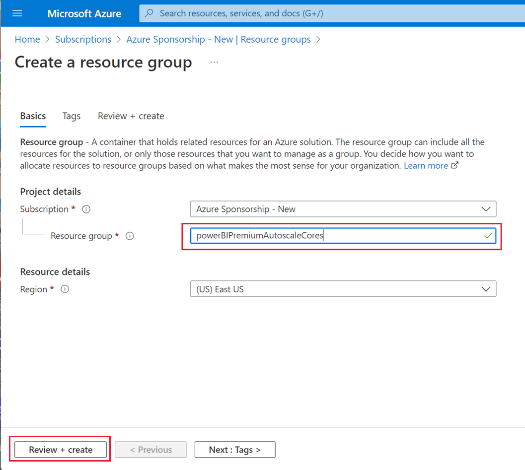 Name your resource group and select Review + create. The following image shows an example resource group named powerBIPremiumAutoscaleCores. You can name your resource group whatever you want. Make a note of the name of the subscription, and the name of your resource group. You'll need to select it from a list when you configure Autoscale in the Power BI Admin portal.