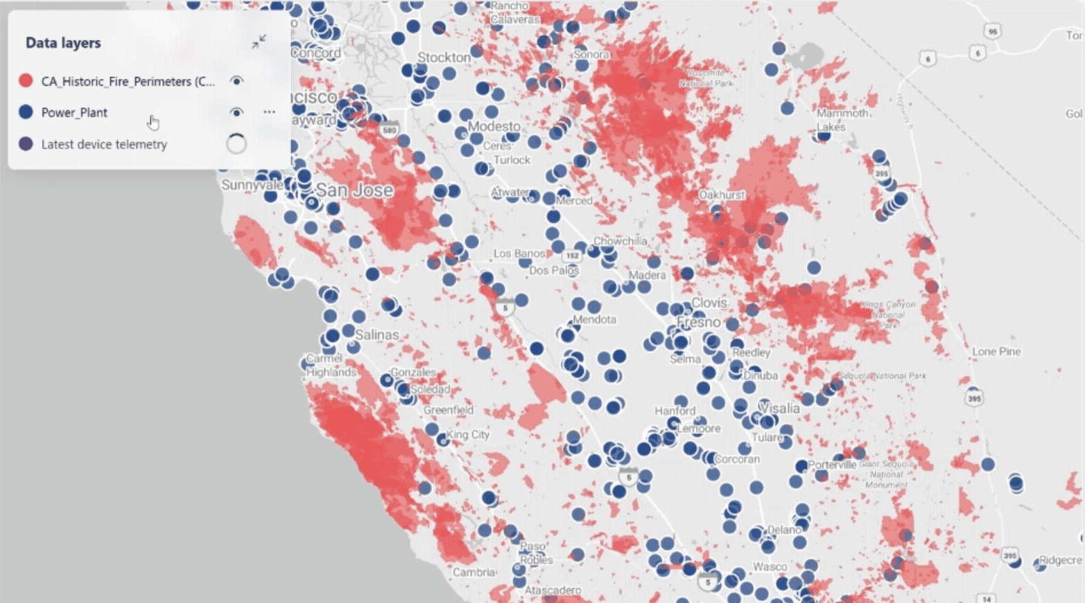 En la captura de pantalla siguiente se muestra cómo reordenar las capas de datos. Para mejorar la claridad visual en las áreas superpuestas, mueva la capa de la planta eléctrica a la posición superior del mapa. La colocación de capas basadas en puntos por encima de capas de polígono facilita la visualización e interpretación de las características superpuestas.