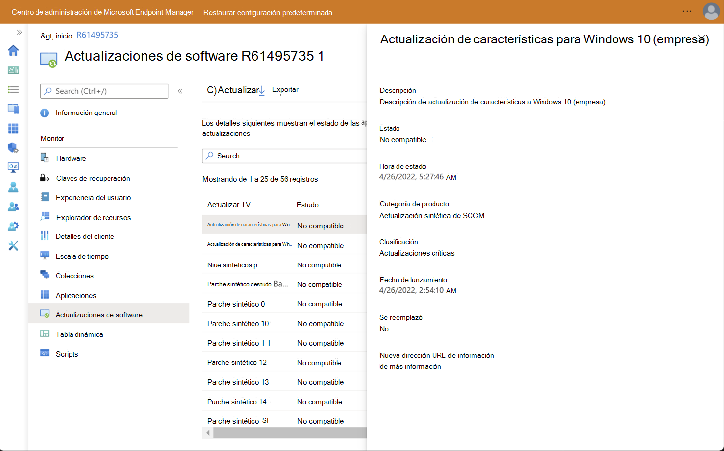 La página Actualizaciones de software muestra el estado de las actualizaciones de software administradas solo por Configuration Manager. Si el dispositivo también se administra conjuntamente y la carga de trabajo de Windows Update se administra mediante Intune, la hoja no muestra el estado de las actualizaciones de software administradas por Intune.