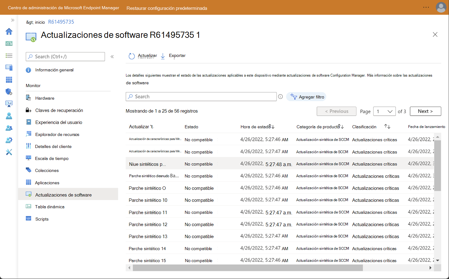 - Cumplimiento parcial: la actualización está instalada y es parcialmente compatible. Es decir, parte de la actualización de software no es compatible.