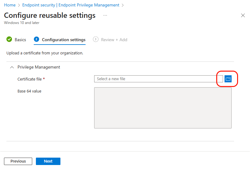 Usar un archivo de certificado en la configuración reutilizable (valor predeterminado): esta opción usa un archivo de certificado que se agregó anteriormente a un grupo de configuración reutilizable para Administración con privilegios para puntos de conexión. Debe crear un grupo de configuración reutilizable para poder usar esta opción.