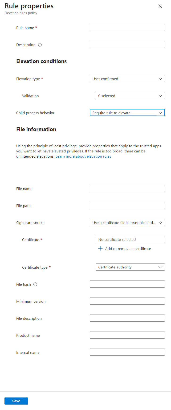 En Configuración, agregue una regla para cada archivo que administre esta directiva. Al crear una nueva directiva, la directiva se inicia incluye una regla en blanco con un tipo de elevación De usuario confirmado y sin nombre de regla. Para empezar, configure esta regla y, más adelante, puede seleccionar Agregar para agregar más reglas a esta directiva. Cada nueva regla que agregue tiene un tipo de elevación De usuario confirmado, que se puede cambiar al configurar la regla.