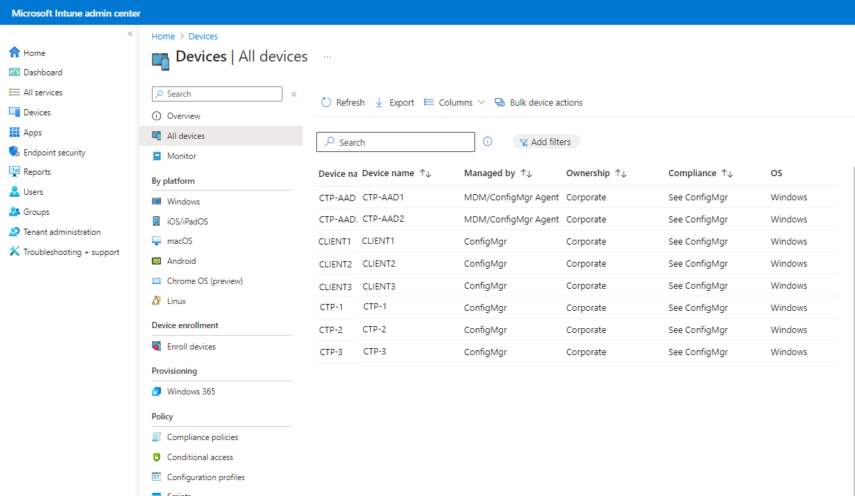 Los dispositivos que se sincronizan a través de la asociación de inquilinos muestran ConfigMgr en la columna Administrado por. Los dispositivos también pueden mostrarse administrados conjuntamente cuando se aplican Administrador de configuración y Intune, y mostrar Intune cuando solo se aplica Intune administración.
