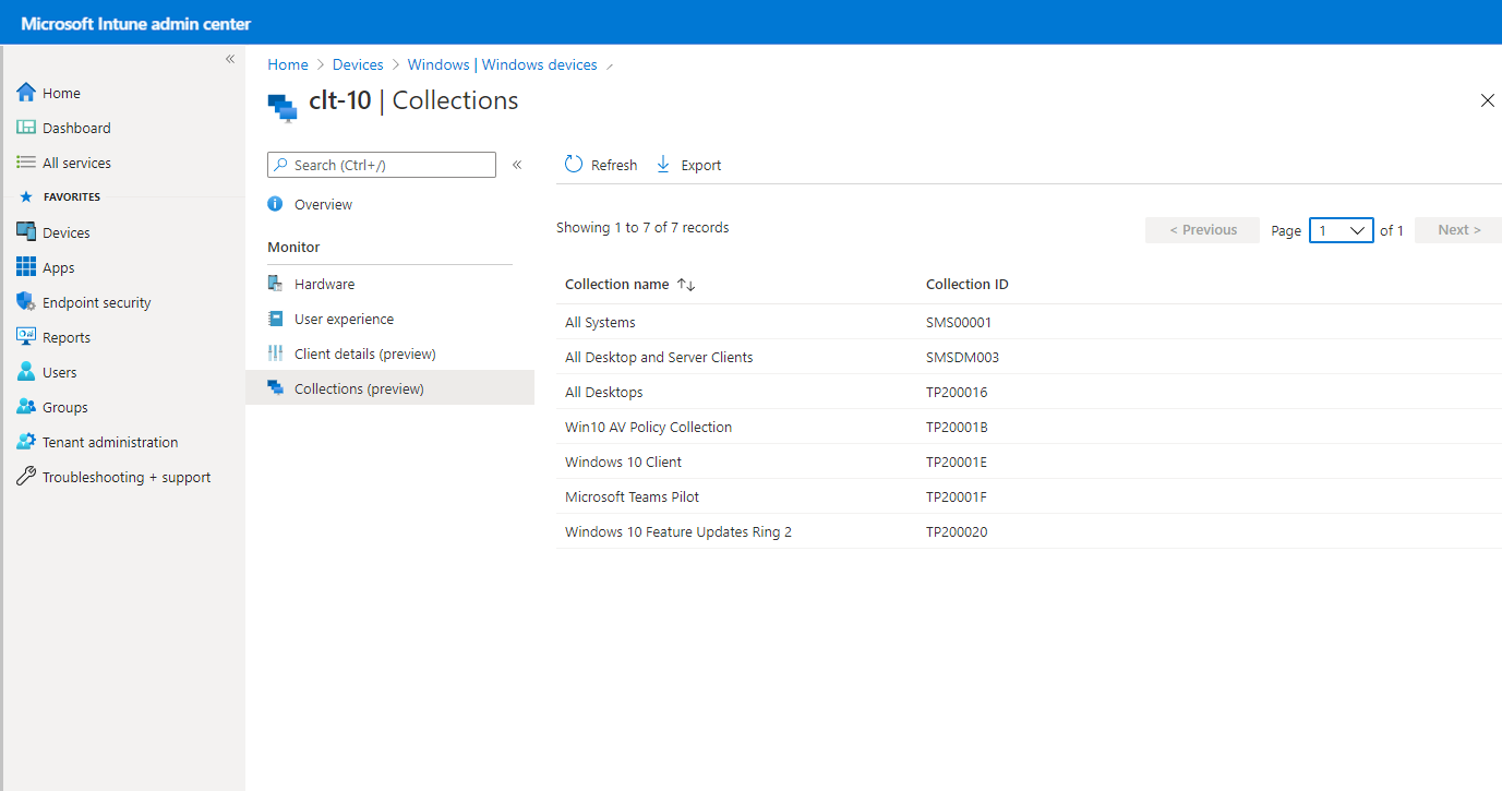Puede ver Administrador de configuración detalles de cliente, incluidas recopilaciones, pertenencia a grupos de límites e información de cliente de un dispositivo específico en el centro de administración de Microsoft Intune.