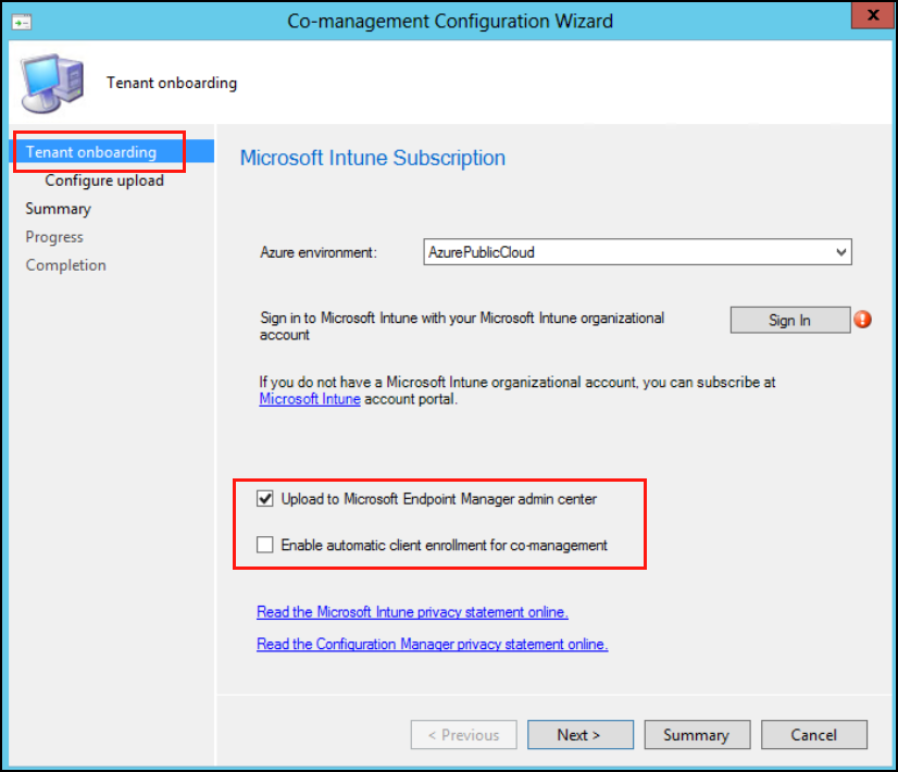 Asegúrese de que la opción Cargar en Microsoft Intune centro de administración está seleccionada en la página Incorporación de inquilinos.