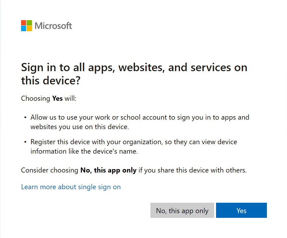 Seleccione Sí para iniciar sesión y registrar el dispositivo. No seleccione No, inicie sesión solo en la aplicación, ya que impide que la inscripción y MAM se apliquen al explorador.