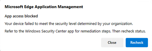 Mensaje bloqueado de acceso a la aplicación: Aparece cuando la directiva de protección de aplicaciones produce un error en la comprobación del nivel de amenaza del dispositivo.