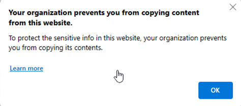 Su organización le impide copiar contenido de este sitio web: Aparece cuando la directiva DLP bloquea una acción de movimiento de datos.