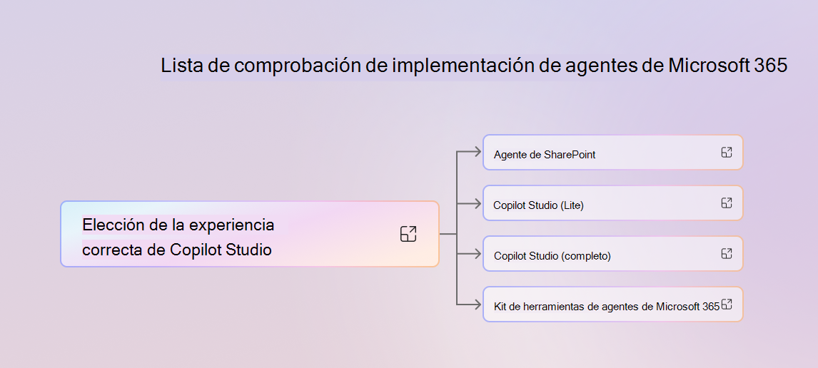 Cuando necesite proporcionar eficaces asistentes de inteligencia artificial que recuperen información en tiempo real y actúen en nombre de los usuarios, así como crear flujos de trabajo especializados, puede usar Copilot Studio para crear agentes personalizados. Para obtener más información, consulte Lista de comprobación de implementación de agentes de Microsoft 365.