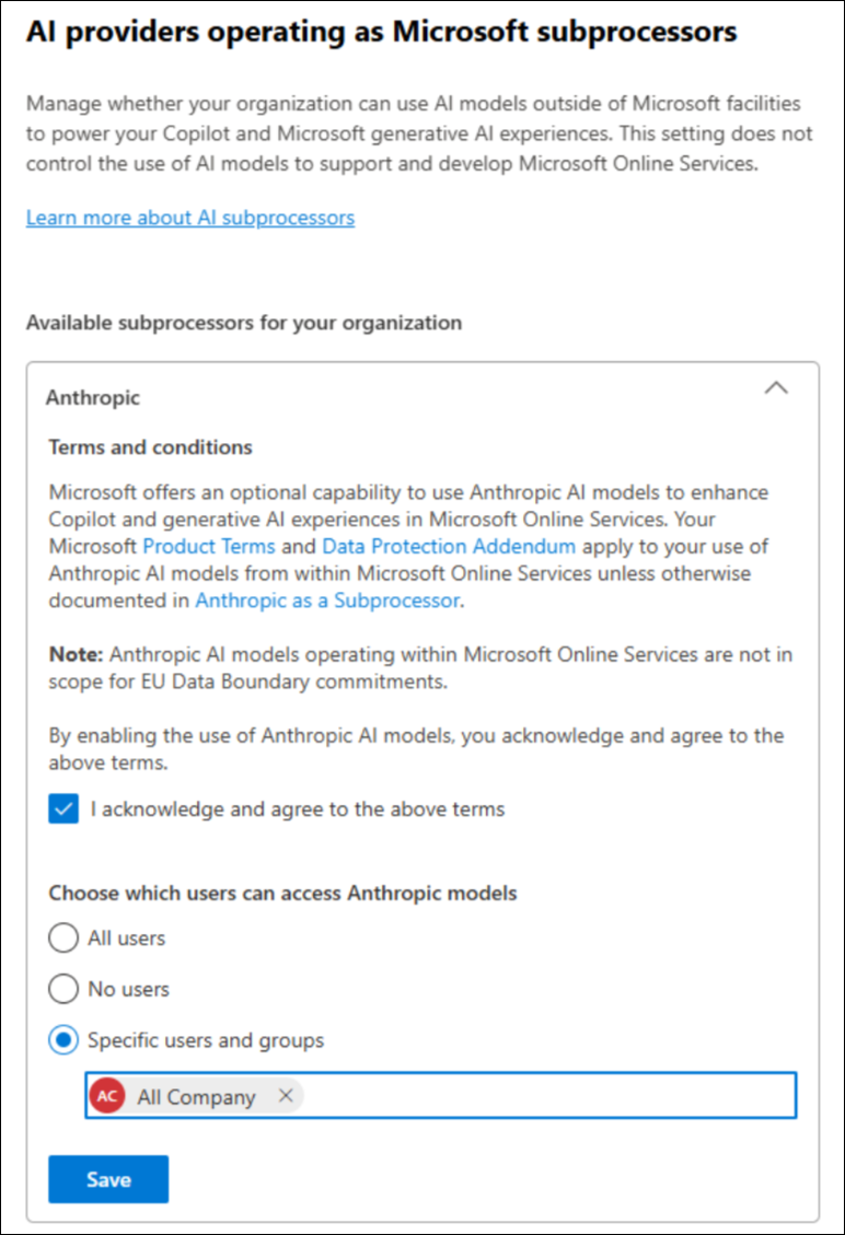Puede restringir el acceso de los usuarios a proveedores independientes de IA mediante la asignación de permisos a usuarios específicos o Microsoft Entra ID grupos de seguridad en el Centro de administración de Microsoft 365. Estas asignaciones se aplican en el nivel de proveedor y se aplican en Microsoft 365 Copilot y Copilot Studio experiencias. Cuando el acceso está limitado por la pertenencia a usuarios o grupos, solo los usuarios asignados pueden usar características o agentes de Copilot que dependen de ese proveedor de inteligencia artificial. Revise las asignaciones de usuarios o grupos existentes y actualice las directivas o configuraciones según sea necesario. Para obtener más información sobre el acceso de usuarios y grupos de seguridad, consulte Asignación de acceso del proveedor de inteligencia artificial a usuarios y grupos. Para obtener más información sobre cómo crear grupos de seguridad, consulte Creación de un grupo de seguridad.
