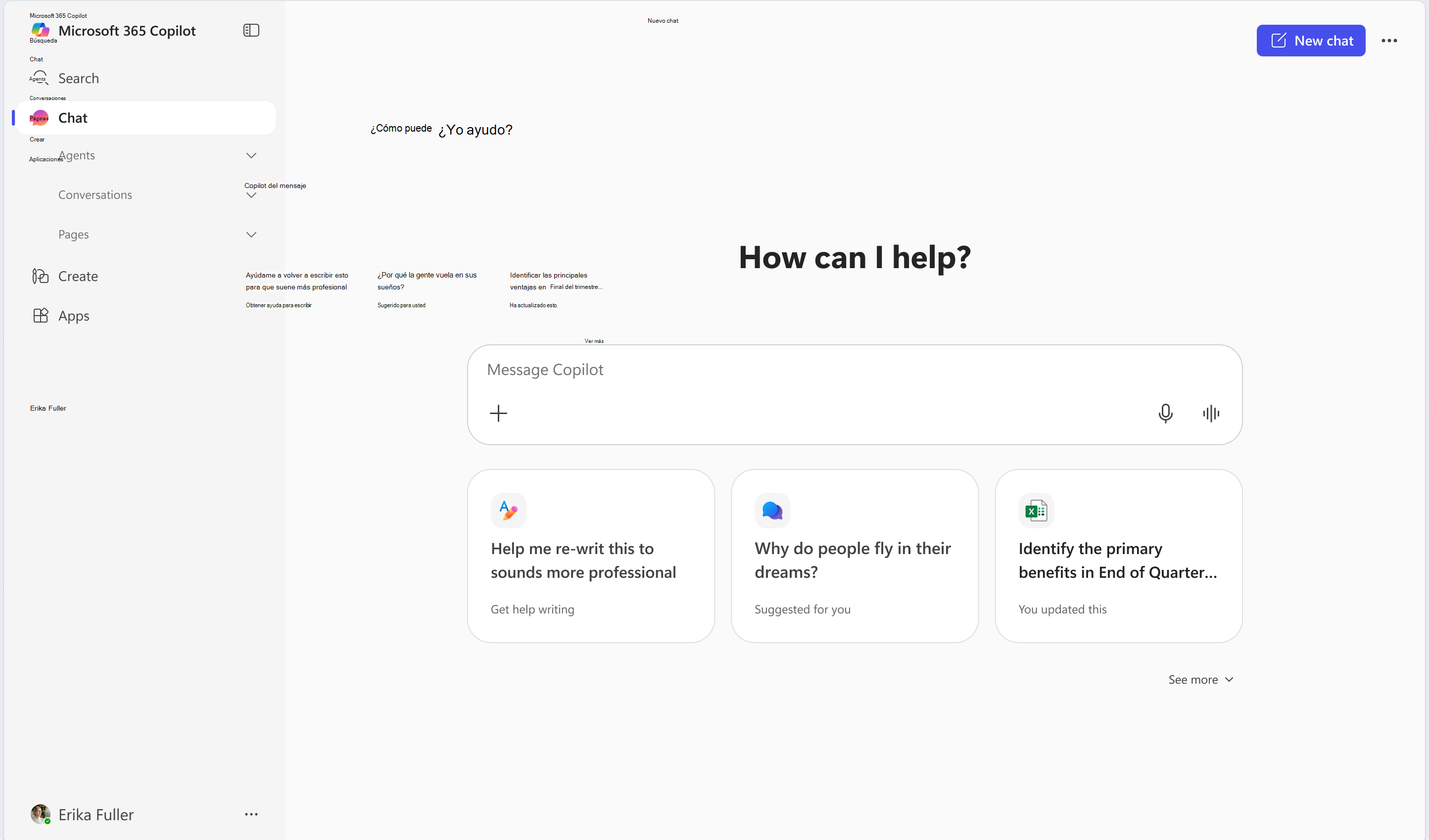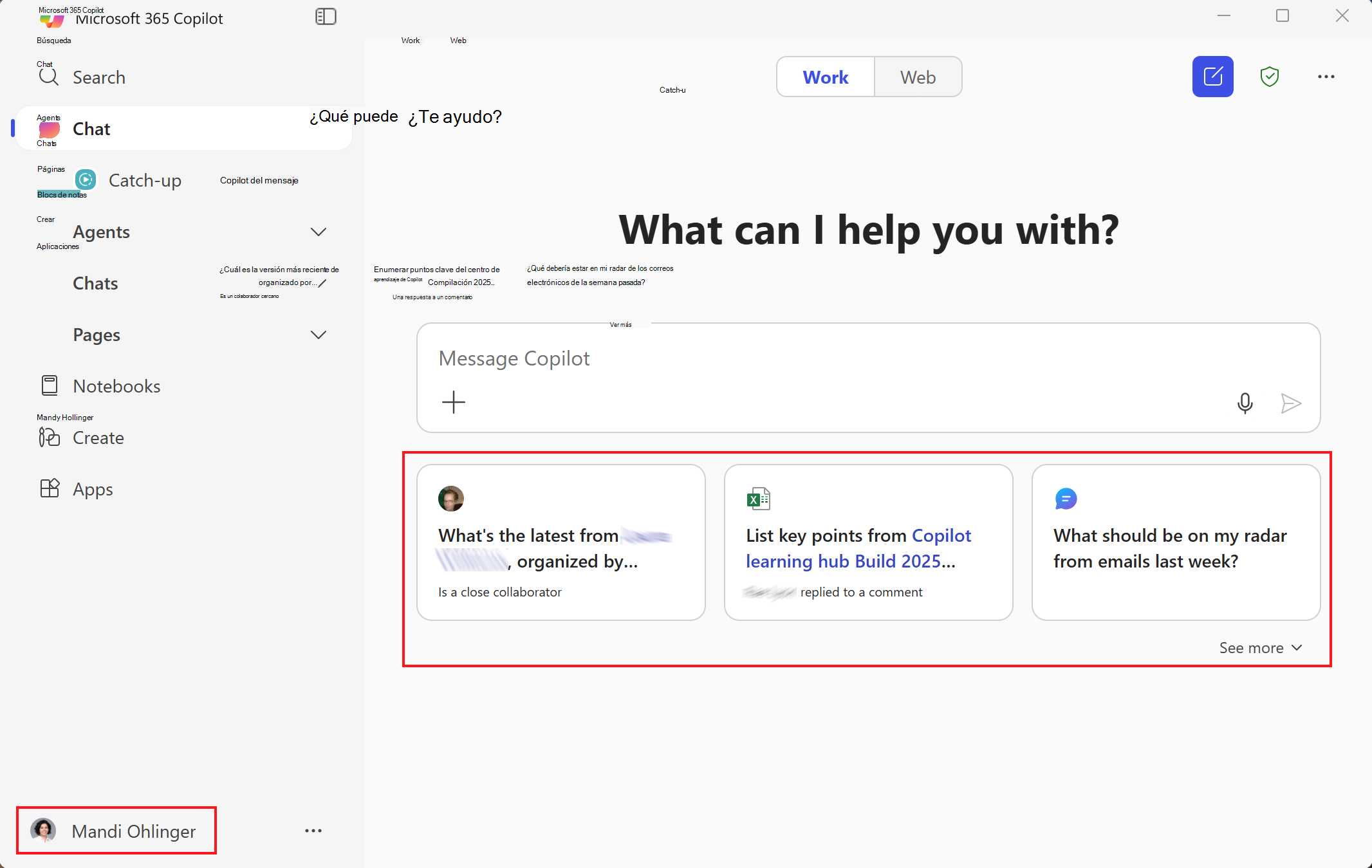 | Chat | ✅ Chat basado en el trabajo y basado en web Se habilita automáticamente en la aplicación Copilot y es la página de aterrizaje predeterminada de la aplicación Copilot. |