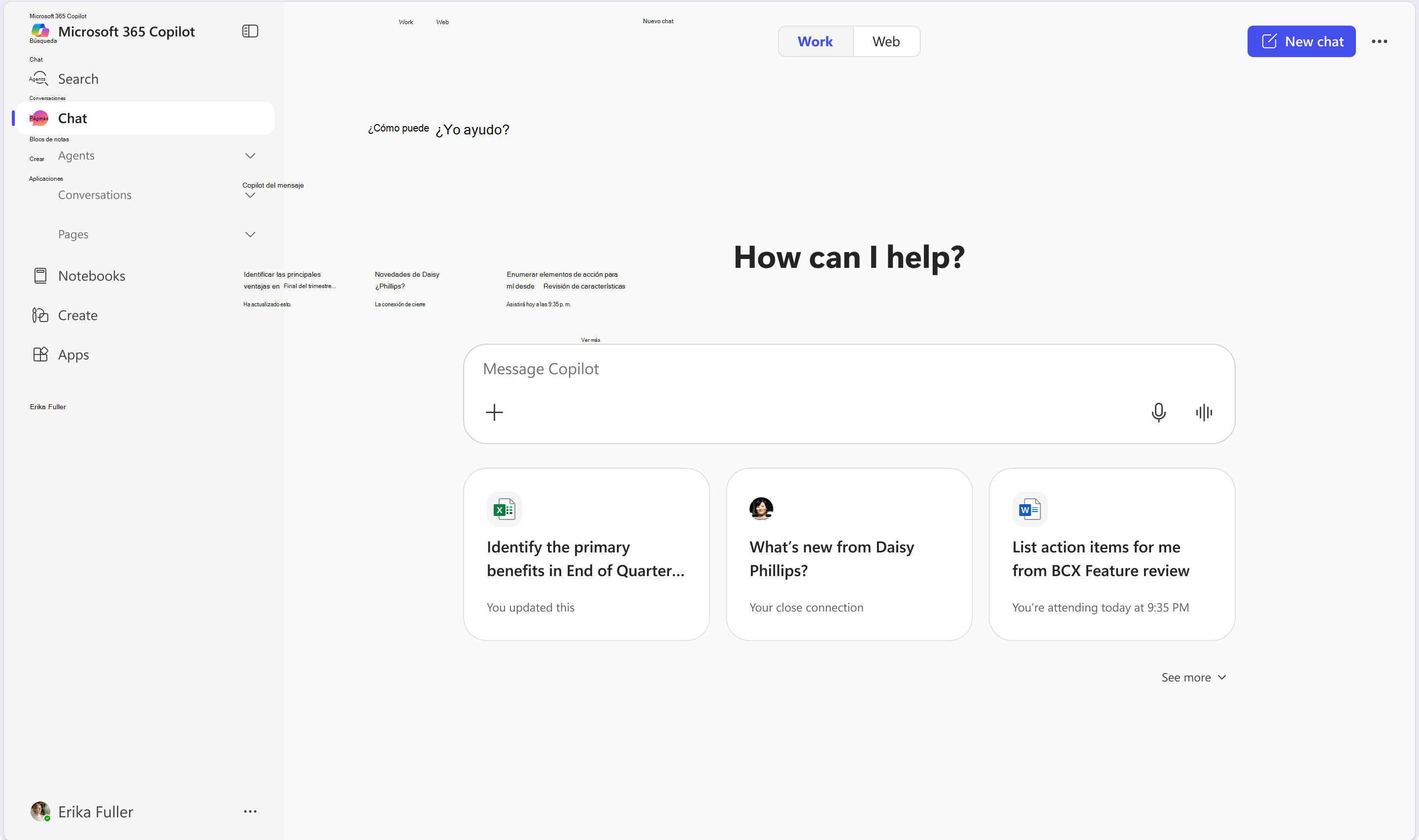 - Chatee con IA para ayudarle a prepararse para una reunión o obtener respuestas a preguntas mediante chat basado en el trabajo y chat basado en web.