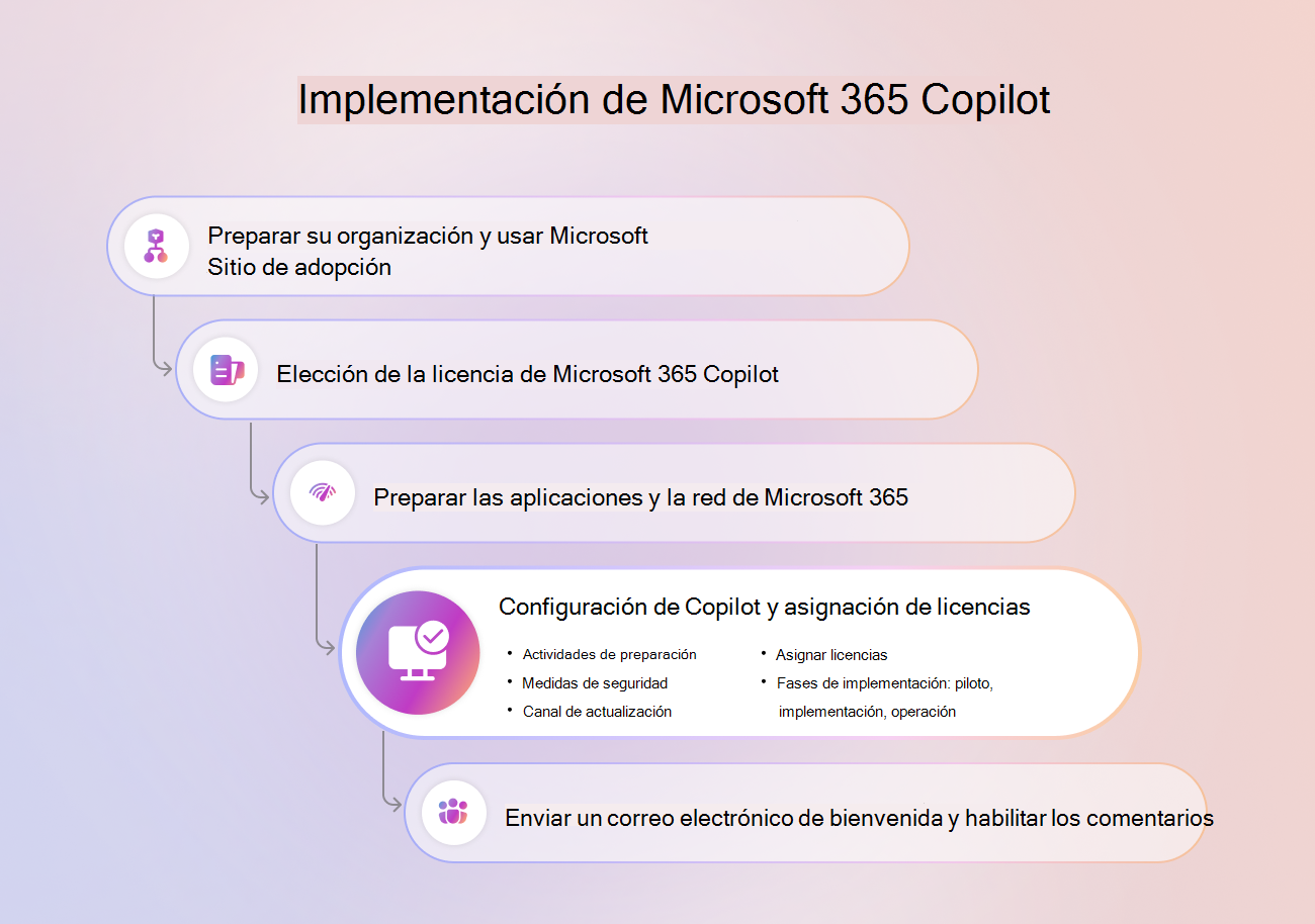 Cuando esté listo para asignar licencias de Copilot a los usuarios, siga estas tres fases: