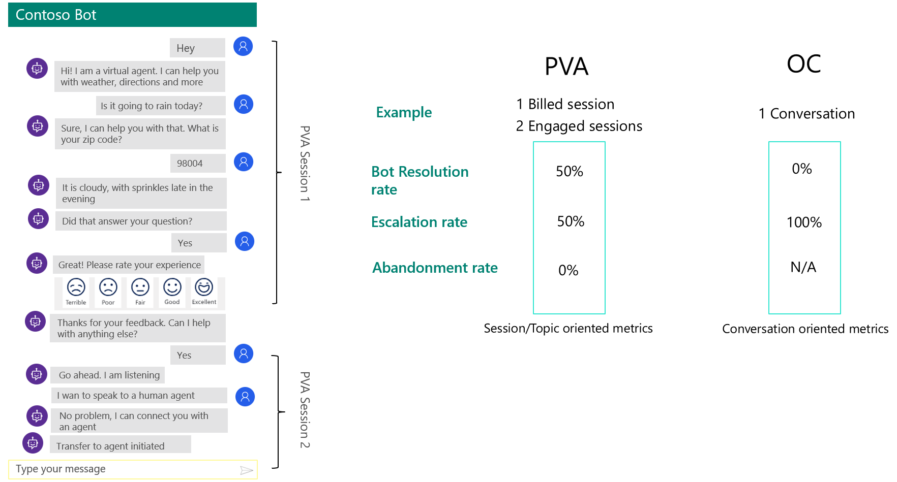 Por ejemplo, Copilot Studio Analytics podría considerar una interacción continua con un usuario como múltiples sesiones analíticas separadas, mientras que Dynamics 365 Omnichannel Analytics lo considera una sola conversación y una sesión de agente. Como resultado de esta diferencia, las tasas de resolución, las tasas de escalación y las tasas de abandono pueden ser diferentes en los análisis de Copilot Studio y los análisis omnicanales de Dynamics 365.