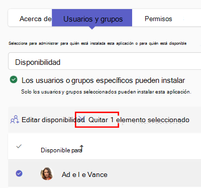 Para quitar uno o más usuarios o grupos de una aplicación, seleccione las filas y seleccione Quitar.