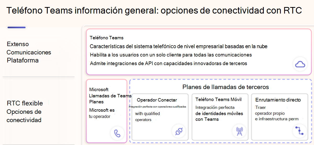 Operador Conectar. Con la oferta Operador Connect, aproveche las ventajas de operadores de líneas fijos de terceros certificados que ya han completado la integración de RTC con Microsoft. Todo lo que se necesita es una suscripción del proveedor de servicios certificado de su elección. Puede habilitar fácilmente el acceso a su inquilino en el Centro de Administración de Teams y asignar sus números de teléfono a los usuarios de Teams. El acceso RTC, los números de teléfono, el servicio de detección de emergencia en EE. UU., el soporte técnico, el SLA y otros productos para su servicio telefónico provienen del partner certificado Operator Connect.