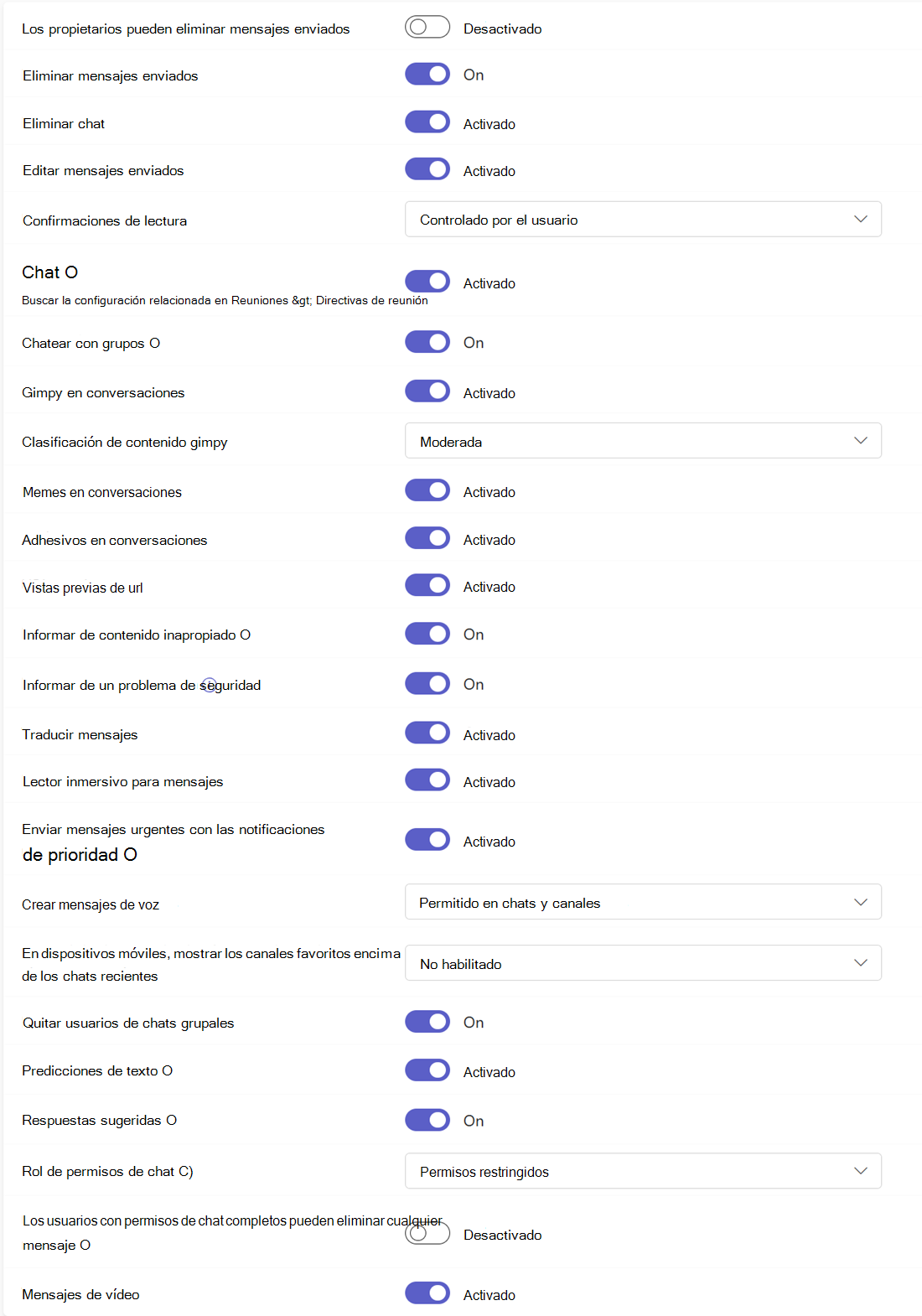 | Permisos de chat basados en roles | Desactivado | Cuando está activado, el chat supervisado está disponible para todos los usuarios. |