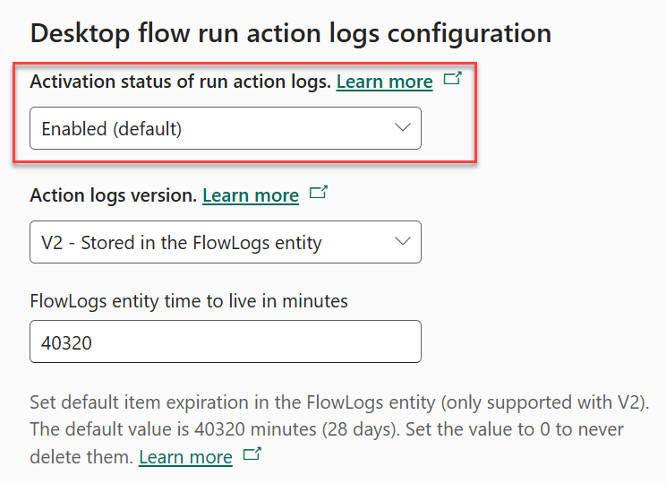 | Deshabilitados | Esta opción efectivamente deshabilita los registros de acciones de ejecución de flujo de escritorio completamente. |