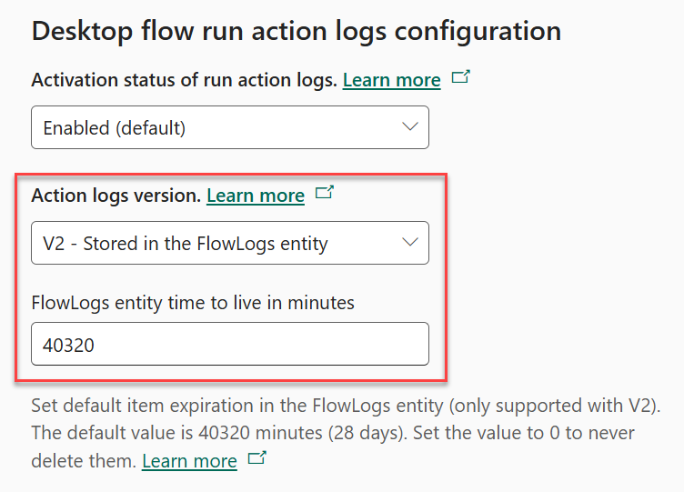 - Los registros V2 solo están disponibles para ejecuciones de flujo de escritorio que se inician desde un flujo de nube a través de la acción del conector de flujo de escritorio.