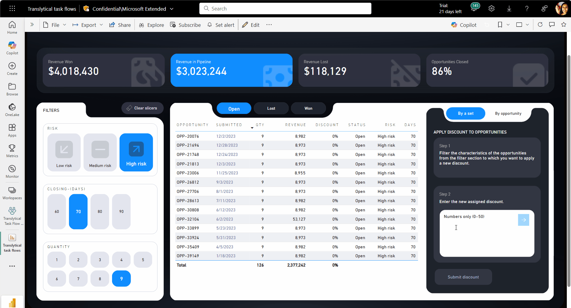 En el ejemplo siguiente se muestra un flujo de tareas translítico que conecta un informe de Power BI que muestra las oportunidades de ventas a un flujo de trabajo que envía solicitudes a Teams. En este ejemplo, puede ver que el usuario filtró la tabla para mostrar solo oportunidades de alta cantidad y alto riesgo con plazos cortos. El usuario solicita un descuento de 10% para estas oportunidades y justifica la solicitud en un campo de comentario. Una vez que seleccionan el botón Solicitar descuento , la entrada de la tabla y los campos de texto se pasan a una función de datos de usuario. La función envía un mensaje en Teams con los detalles para que la solicitud se pueda aprobar o rechazar.