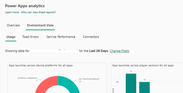 Seleccione el entorno y el período de tiempo de las listas desplegables y, a continuación, seleccione Aplicar para guardar los cambios. Todos los informes de análisis Power Apps ahora reflejan esta selección.