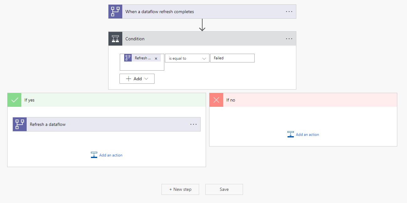 Los flujos de datos de Power BI Gen1 ahora están en un estado obsoleto. En lugar de configurar flujos de Power Automate para la lógica de reintento, Dataflow Gen2 se integra directamente con las canalizaciones de Data Factory, que proporcionan directivas de reintento integradas, programación y ejecución condicional. Para obtener información sobre cómo actualizar los flujos de datos existentes, consulte Actualización de Dataflow Gen1 a Dataflow Gen2.
