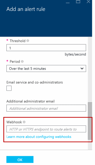 Puede agregar o actualizar el URI de webhook, en Azure Portal, vaya a Create/Update Alerts (Crear/Actualizar alertas).