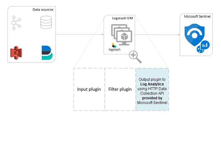El complemento de salida de Microsoft Sentinel para Logstash envía datos con formato JSON al área de trabajo de Log Analytics mediante la API REST de recopilación de datos HTTP de Log Analytics. Los datos se incorporan en los registros personalizados.