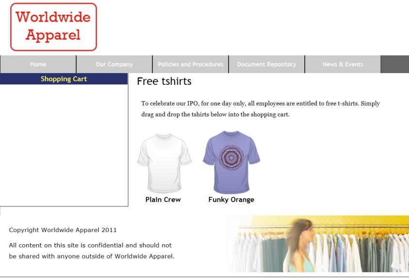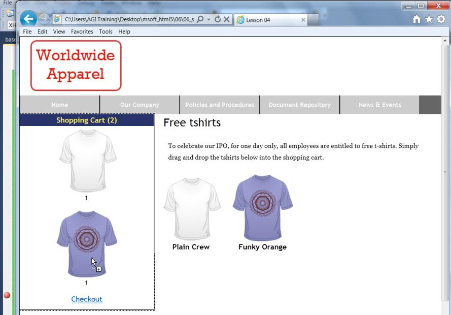 9 Guarda el archive y vuelve a probarlo e el navegador. Si arrastras las camisetas hacia la zona de la lista, quedarán añadidas a la lista de artículos comprados.