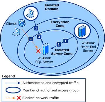 In addition to the protections provided by the firewall and domain isolation, Woodgrove Bank wants to provide additional protection to the computers that are running Microsoft SQL Server for the WGBank program. They contain personal data, including each customer's financial history. Government and industry rules and regulations specify that access to this information must be restricted to only those users who have a legitimate business need. This includes a requirement to prevent interception of and access to the information when it is in transit over the network.