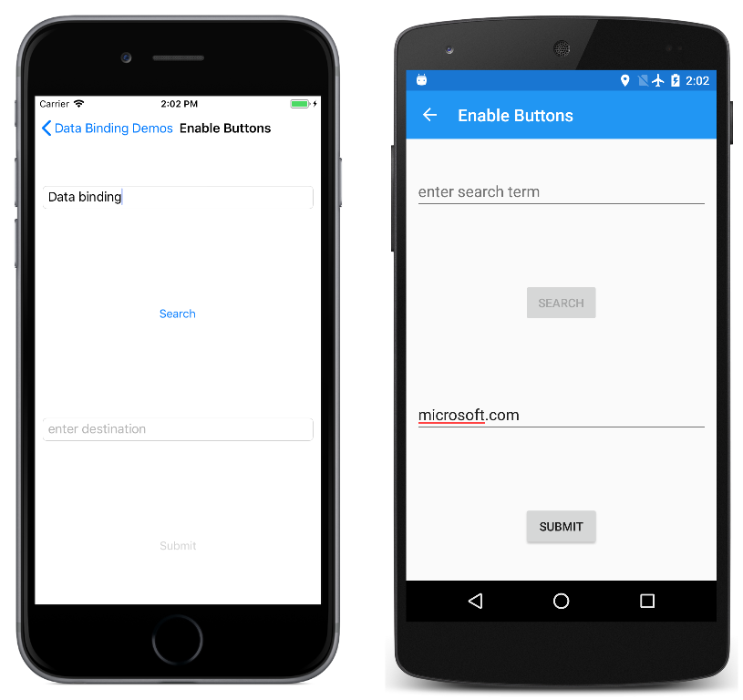 La página Enable Buttons (Habilitar botones) muestra una necesidad común cuando un Button realiza una operación basada en texto que el usuario escribe en un vista Entry. Si no se ha escrito nada en el Entry, el Button debe deshabilitarse. Cada Button contiene un enlace de datos en su propiedad IsEnabled. El origen de enlace de datos es la propiedad Length de la propiedad Text de la Entry correspondiente. Si esa propiedad Length no es 0, el convertidor de valores devuelve true y se habilita el Button:
