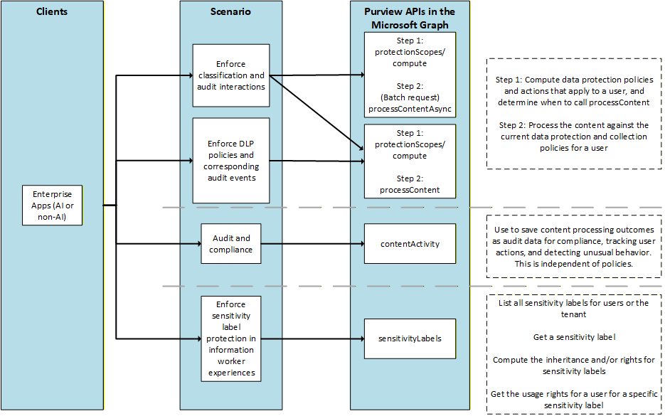 Enterprise applications (AI, line-of-business, SaaS) call Microsoft Purview APIs that are available in Microsoft Graph to evaluate and enforce data protection policies at runtime.
