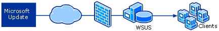 The most basic WSUS deployment consists of a server inside the corporate firewall that serves client computers on a private intranet, as shown in the "Simple WSUS Deployment" illustration below. The WSUS server connects to Microsoft Update to download updates. This is known as synchronization. During synchronization, WSUS determines if any new updates have been made available since the last time you synchronized. If it is your first time synchronizing WSUS, all updates are made available for download.
