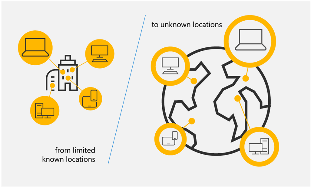 En el diagrama siguiente se muestra el cambio de la protección tradicional con controles de red a la izquierda (desde ubicaciones conocidas limitadas) a la protección moderna con Confianza cero a la derecha (a ubicaciones desconocidas) en la que se aplica la protección independientemente de dónde se encuentren los usuarios y los dispositivos.