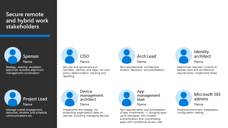 En este escenario (protección del trabajo remoto e híbrido) se evalúa y se protegen las identidades, dispositivos y datos a través de las redes que los usan. Como las tecnologías pueden ser potencialmente perjudiciales, se recomienda un enfoque por fases, empezando por proyectos pequeños que ofrecen victorias rápidas que sacan provecho de las licencias existentes y tienen un impacto mínimo en los usuarios.