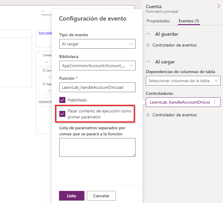 Cuando se registra un controlador de eventos, se puede pasar el contexto de ejecución como primer parámetro. Cuando se registra el controlador de eventos con las propiedades del formulario, esta es una opción que se puede habilitar. En la imagen se muestra el registro de un controlador OnLoad y la habilitación del contexto de ejecución.