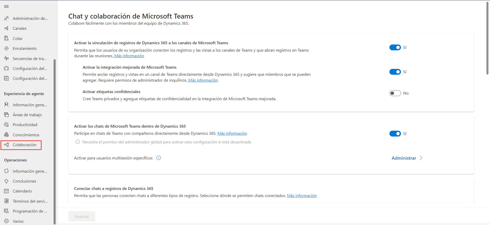 Para usar la característica de chat de Microsoft Teams, debe asegurarse de que esté habilitada en aplicaciones de interacción con el cliente y aplicaciones personalizadas. Para garantizar que funcione correctamente, requiere determinados permisos para acceder a los datos de Teams. Para obtener más información, consulte Permisos obligatorios. Una vez que disponga de los permisos necesarios, puede habilitar la funcionalidad en la aplicación Centro de administración de Customer Service. En el grupo Experiencia de agente, seleccione Colaboración. Hay cuatro opciones disponibles para configurar: