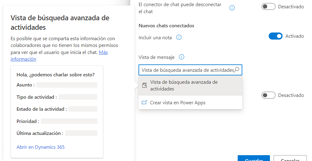 Proporcionar contexto para nuevos chats vinculados: si el botón de alternancia Mensaje de introducción está activado, cuando alguien inicia el chat, podrá enviar información relacionada con el registro vinculado para dar contexto a los colaboradores.