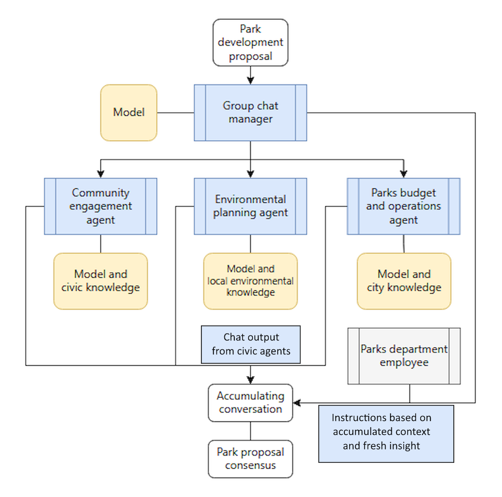 - El administrador de chat facilita un debate estructurado en el que los agentes desafían las recomendaciones del otro y defienden su razonamiento. Un empleado del departamento de parques participa en el subproceso de chat para agregar información y responder a las solicitudes de conocimiento de los agentes en tiempo real. Este proceso permite al empleado actualizar la propuesta original para abordar las preocupaciones identificadas y prepararse mejor para los comentarios de la comunidad.